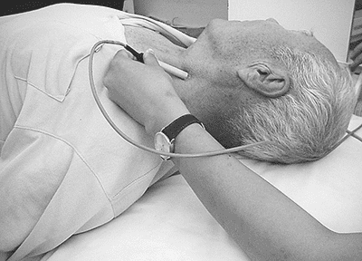 顱外頸動脈的檢測部位位于頸部,均為皮膚及軟組織,因此正常情況下檢出率接近100%。探頭置于胸鎖乳突肌內側緣或輕壓于胸鎖乳突肌上是檢測頸總動脈(CCA)的部位,通??梢愿杏X到CCA明顯的搏動;探頭沿頸部向上移動抵在下頜角下的部位(下頜下窗)(見下圖),此部位是檢測ICA顱外段(extracranial internal carotid artery,EICA)和頸外動脈(ECA)的部位。探頭朝下置于鎖骨上窩,可獲得鎖骨下動脈(SubA)和椎動脈(VA)起始部的血流信號,但由于走行變異較大,VA起始部的檢測往往較為困難,易造成漏診。此外,在耳屏后下方,即骨性標志乳突下1cm左右還可以檢測到VA環樞段血流信號。