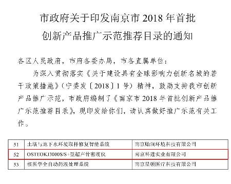 科進3000S/S+型超聲骨密度儀入選《南京市2018首批創新產品推廣示范推薦目錄》