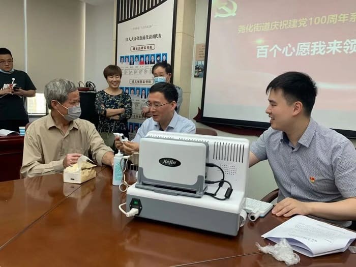 活動最后,公司領導親自用自主研發的超聲骨密度儀為五位老同志測量骨密度,并為老人耐心講解說明測量報告結果,給他們提出身體保養建議。
