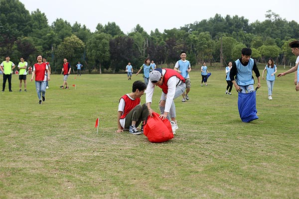 第二個比賽是四人五足,顧名思義就是每組派出4名隊員參加,用游戲道具將4個人的腿兩兩綁在一起,四人并行,先到終點的隊伍獲勝,這個游戲考驗的就是每組隊員配合的默契性,不是一個人跑的快就可以,一定要和大家步調一致才行。一二一二、一二一二紅隊的四個隊員邁著整齊的步伐,喊著響亮的口后,雖然一開始他們并不是最快的,但是他們一直跟隨著自己的口號節奏,逐步趕上前面的隊伍,有的隊伍一開始很快,但是缺乏口令,走著走著步調就不一致,有的隊伍中的隊員自己很著急,步子邁的很大,沒有顧及到其他隊員,導致摔倒或道具掉落,按照游戲規則要調整好了才能繼續比賽。最終紅隊獲勝。這個游戲就是告訴我們在工作中需要相互配合,才能完成任務,很多事情不是你一個人就可以,個人英雄在企業里是不存在。