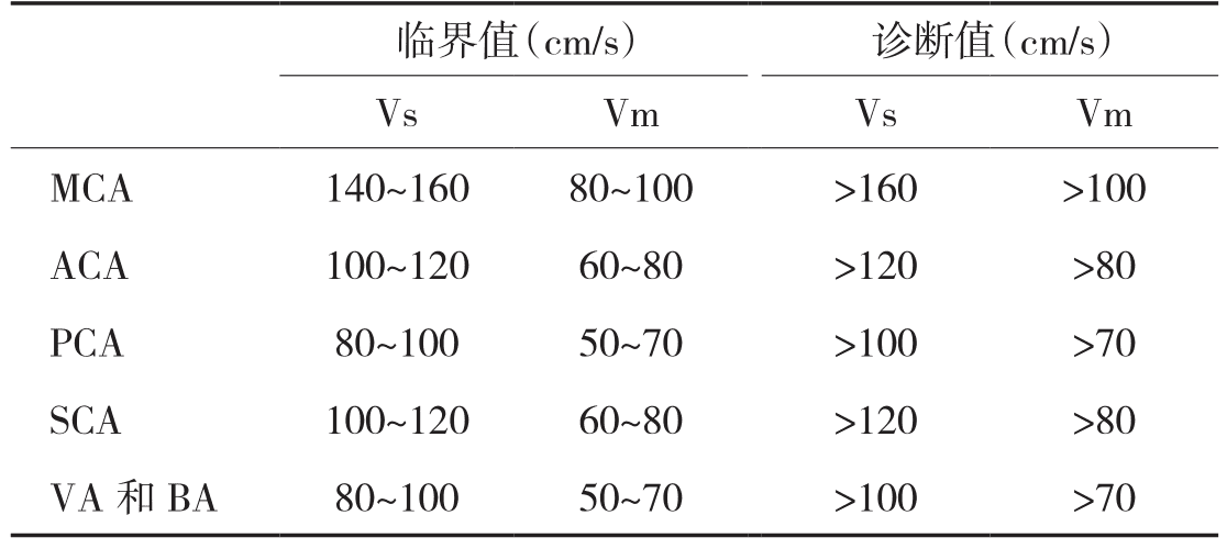 當顱內動脈的管徑狹窄程度<30%時,通常不出現血流動力學改變,只有當管徑狹窄程度>30%,TCD才可以檢測到狹窄部位血流速度輕度增快,狹窄程度>50%,TCD才可以檢測到狹窄部位血流速度明顯增快。血流速度增快是診斷血管狹窄最重要的指標。由于血流速度受許多因素的影響,故血流速度的正常值及診斷顱內血管狹窄血流速度標準尚未完全統一。目前多采用北京協和醫院顱內動脈狹窄的診斷標準(見表)。